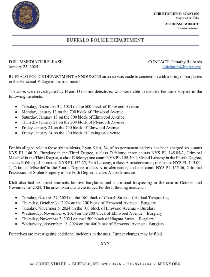 A noteworthy inclusion in this listing include Ryan Klatt who was arrested for multiple burglaries, mostly in the Elmwood area. To counter some online claims that he was "caught and released", nope, as of this listing at least -- he's in the pokey sorting all of this out.
